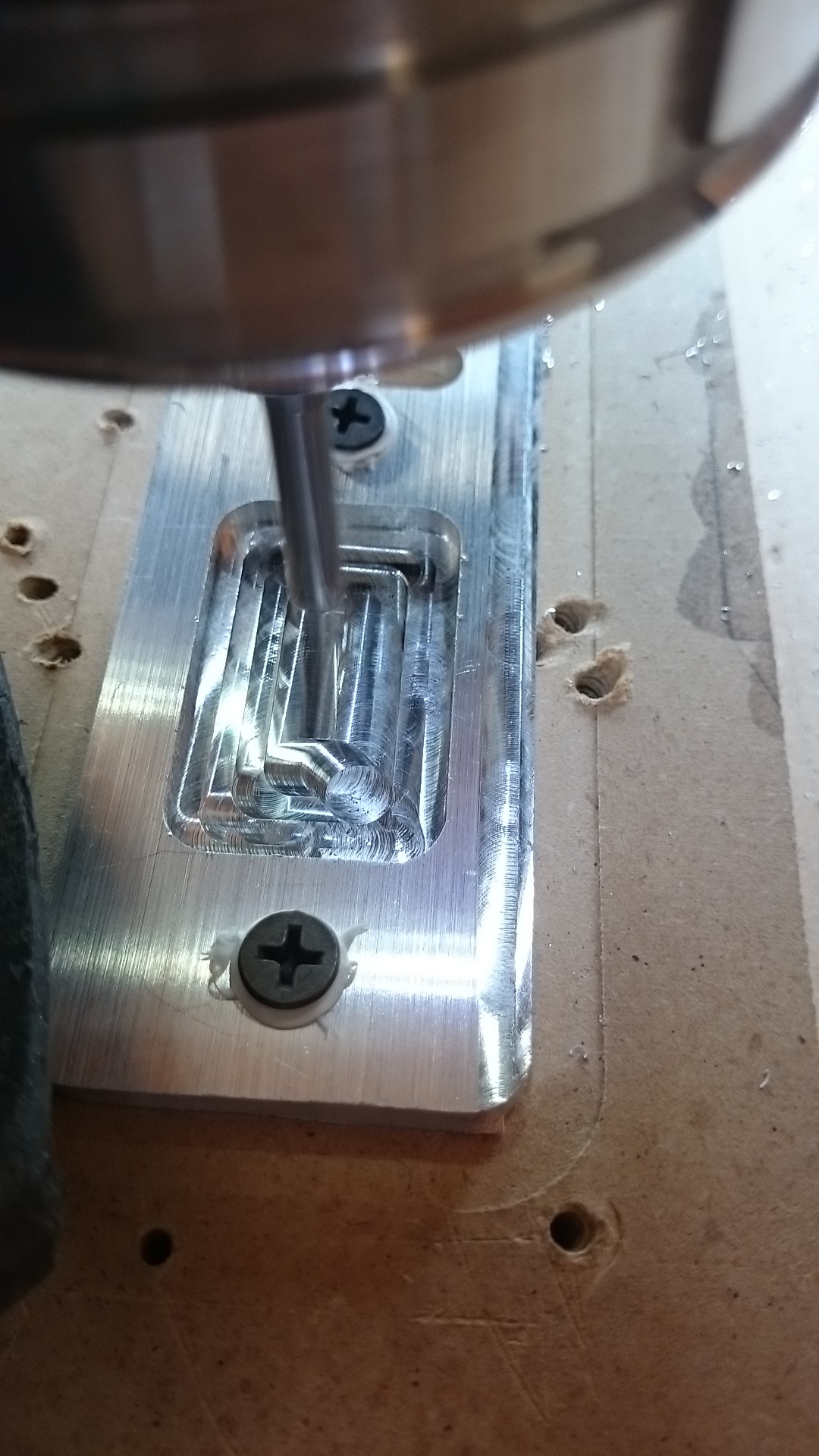 These settings and wiping the cut path with a Q-tip soaked in clean motor oil worked nicely. Here is a picture showing a pocketing operation in progress and a completed contour and small facing pass.
