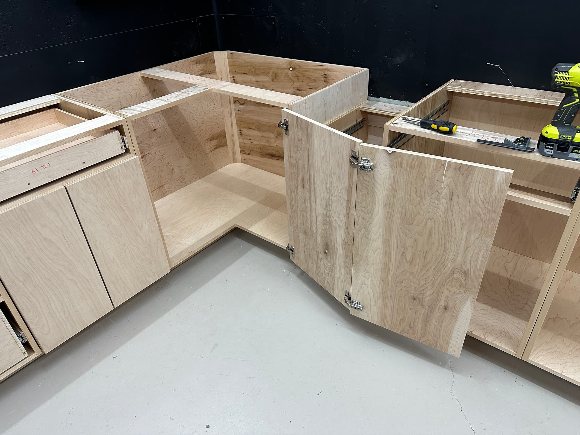 I also added a piece of wood to the back of the corner cabinet so stuff doesn’t fall through. I also found out the hard way, you can’t insert the shelf after the counter is installed.