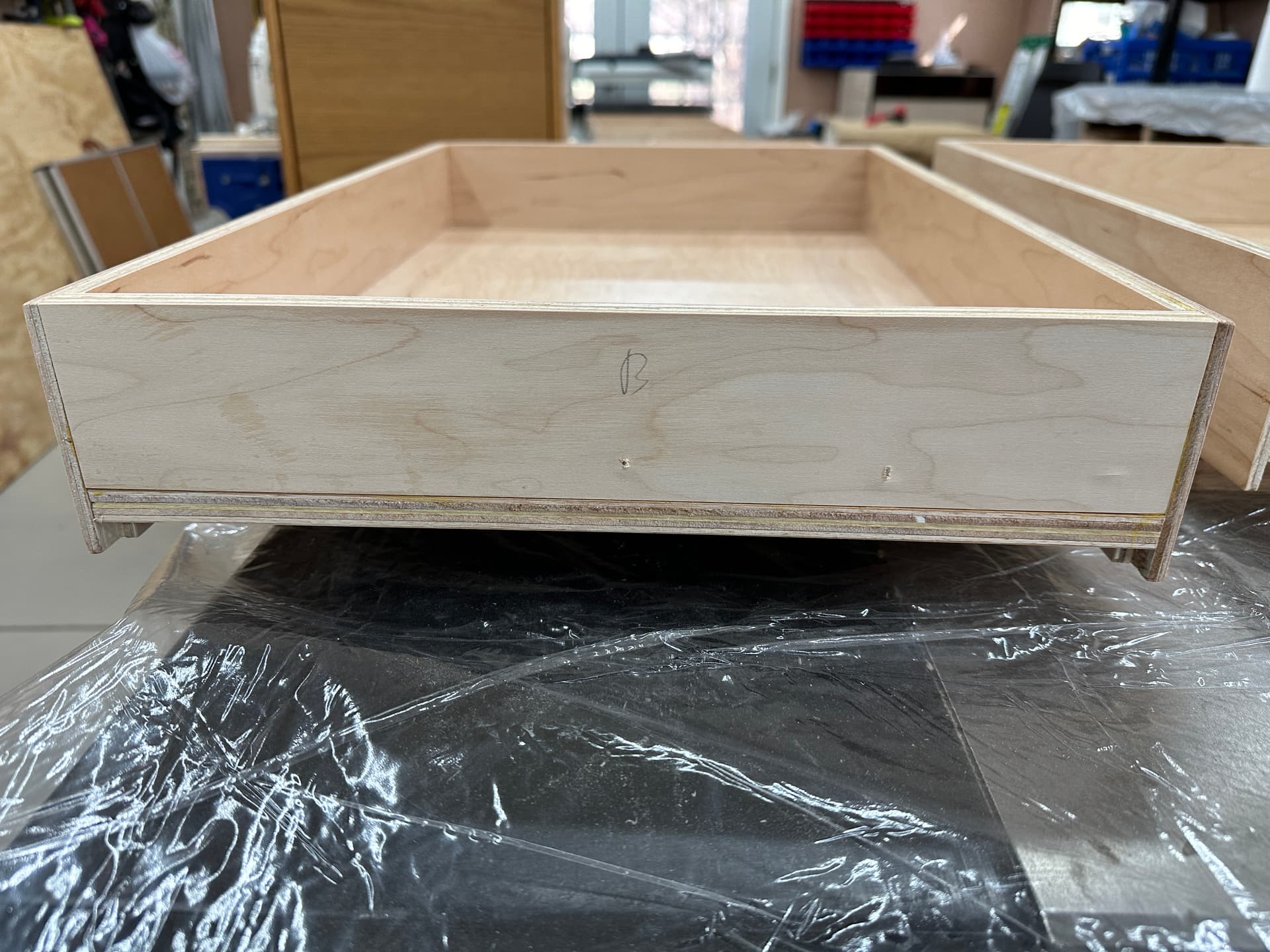The back on my design stops above the bottom, which carries through to the very back, but there’s no reason the back couldn’t have a rabbet, since it was mentioned that the Blum undermount hardware won’t work with this type of bottom. And honestly, after assembling my drawers, I ended up gluing the bottom in, anyway, so capturing it at the back might have made assembly slightly easier.