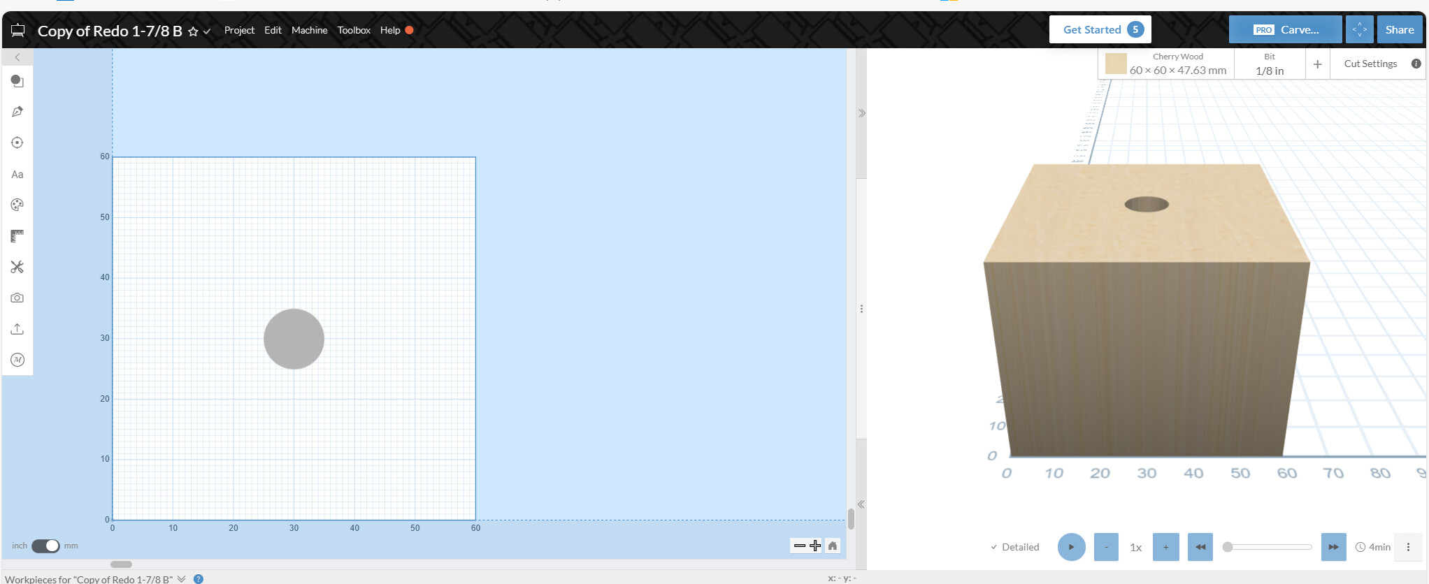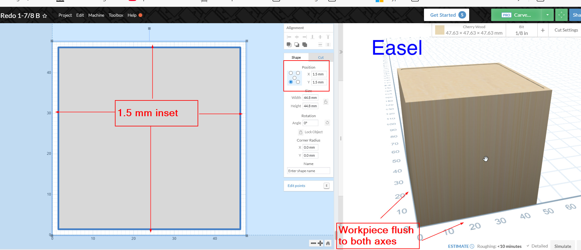 I’ve created numerous test projects with an eye on cutting a wooden set of alphabet blocks for my granddaughter. I have the design I was looking for and test cuts work great on scrap wood. However, in every case, the cut starts about 1/8 too far from both the X and Y axes. Z is fine. I finally just created a simple box in a clean project to see if I’d screwed some thing up in the others where I had resized letters to fit where I want them to be on the workpiece.