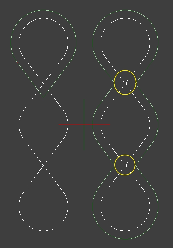 This looks very simple, but in reality it is very very complicated. An equidistant calculation of a self-intersecting path is not possible.