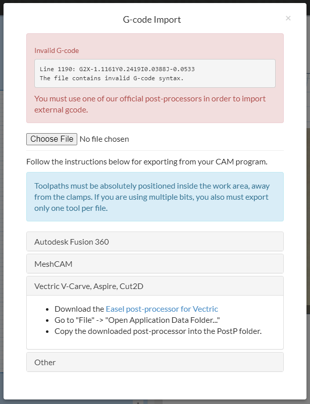 I am a new X-Carve user and have only been able to make a couple of things while I learn and work out the 'kinks;. I also have Vetric VCarve software that I enjoy designing on as it has so much more potential and ability to do much more than just Easel. I recently upgraded the version to 11 from 10.5. However, now I cannot import my toolpaths/g codes from Vetric as Easel says that there is a ‘syntax error’ in the code. I reverted back to the earlier version and was able to import the g code without any problems. I have also downloaded the post processor to the file as instructed but to no avail.