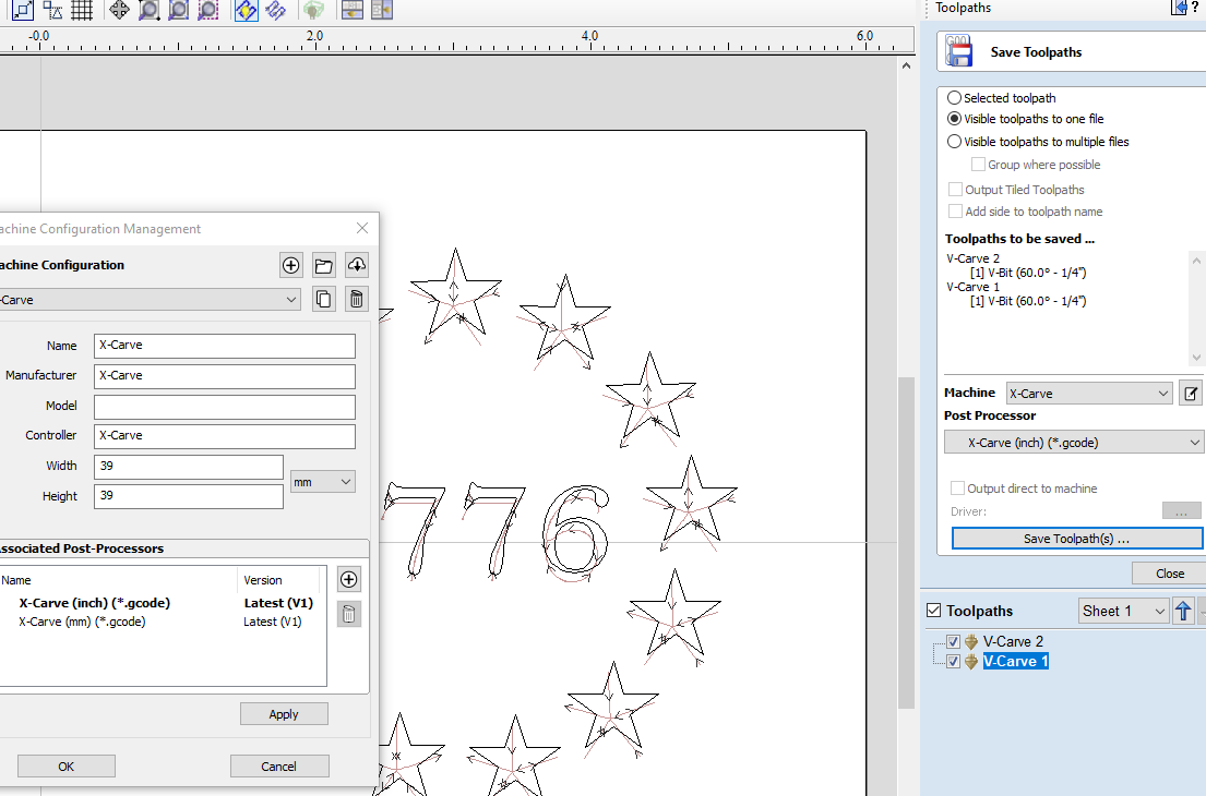 Vetric’s V11 software now includes that post processor found in the Easel guide pre-installed but re-named as “X-Carve” you’ll need to select one of these and apply it, then you can save the gcode and it should load without the syntax error…