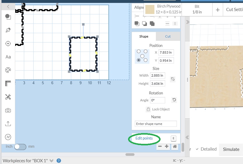 The drawings can be moving to where you want them on the work piece. Choose one side and click on edit points.