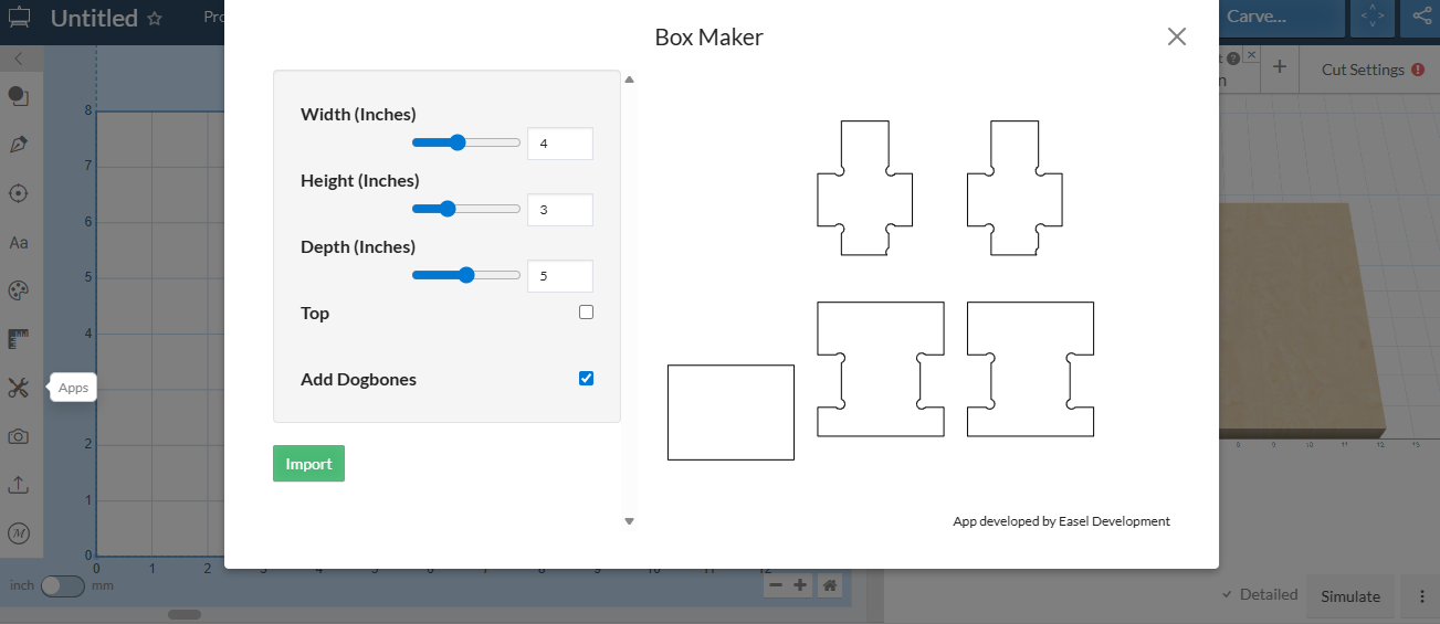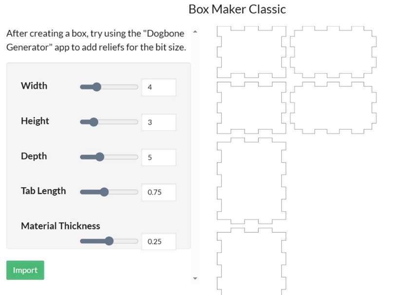 It has been best for me to set the Material Thickness first. This allows the tabs to be the correct size. The dog bone feature allows the box to be assembly to be tight without and manual filing of the corners. There are some wonderful features included in the app library so [;ease check them out.