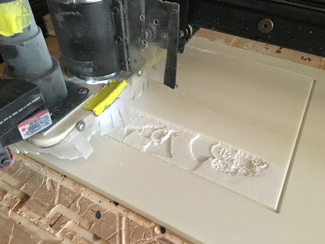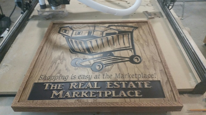 I took some tinkering to get everything running, but so far so good. As long as I cut slow and not to deep, it works like a champ. I started off making a sign for a friends reality company. I am using the Dewalt router and it really does a good job. I used oak paneling and filled in the pocket cuts with acrylic casting resin. Turned out great considering it was the first time I tried to make a sign. I used VCarve Pro to lay it out and cut it.