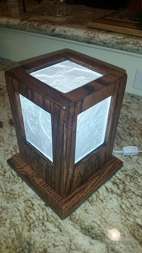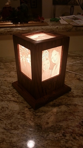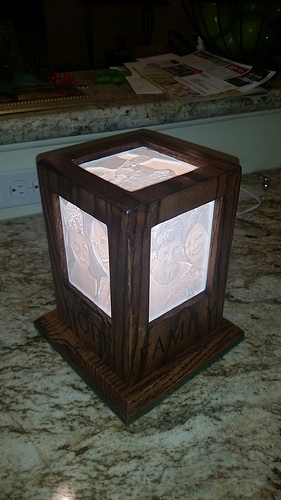 I saw some examples of Lithophanes on the forum and decided to try to make my sister in law a lithophane lantern for her Christmas present. Took a bit of playing around with different materials and cut depths but I could not be happier with it. I put a lithophane of her and her family on each side and did a resin text inlay on each panel. Wound up putting in one of those remote control color led bulbs in it and it looks great. Biggest learning curve with Lithophanes was finding out how deep the xcarve can cut the rouging pass without losing steps. I figured out if I cut the roughing pass in two steps, with a 1/8" ball nose, .030 stepover, and no faster than 50 in/min feed, it will work. Also, I tried a lot of materials, and Candlestone is by far the best. However, I did not try Corian.