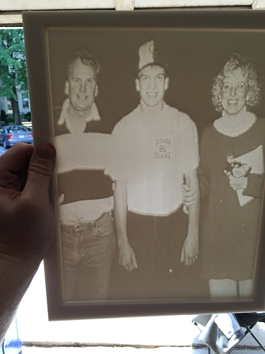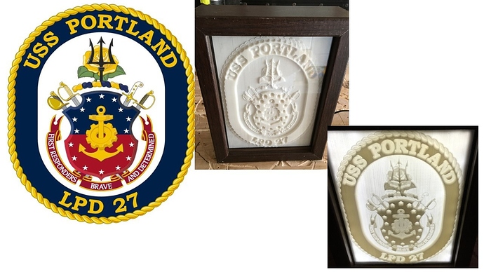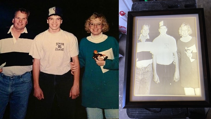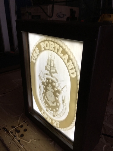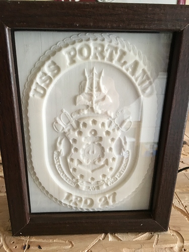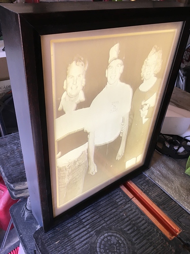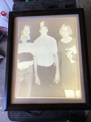 Completed a 11"X14" lithophane cut from a large piece of 0.47" thick corian. The backside cutout took about 2.5 hours with an 8mm bit and easel software. I cut the front with a 20 degree double ended bit using picengrave pro to generate the code (2.75million lines) and picsender software. The front took about 10 hours to cut out. I used 1/4" plexiglass as the light source with small lines of 0.05" dots engraved with my cheap Chinese laser. I had to use two pieces due to the limited size inside the laser. I used basic led strip lights along the edge of the plexi with a power cord soldered to the open end of the lights and a basic on/off switch installed. I use the light diffuser film roll sold by Inventables behind the plexi as well as a basic aluminum foil. To fill the open space of the 11X14 Michaels retail store frame, I use a 1" foam cut to size in all dimensions to ensure the items don’t shift. Total cost was about $60. Total time for the project was about 20 hours.