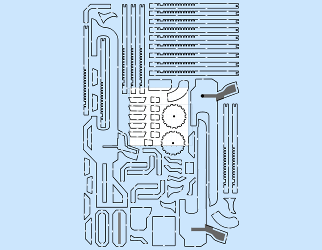 This was designed to be cut on a 1/2 inch piece of plywood and works best with a 5+ layer sheet of such as Baltic Birch. It was laid out to to fit my machine which is the X-1000mm by Y-1800mm frame. If you do not have this size machine you would need to re-lay it out but be cautions when moving parts around the tabs shift all over the place when re-arranging. On my machine I cut a 4 X 8 sheet of plywood into 3 pieces 48 x 31-1/4 inches to fit the full width of the machine leaving just a fraction of scrap. The main part of the gun is 36-1/4 X 11 roughly, so you will need a larger machine to cut this piece unless you try to shrink the design.