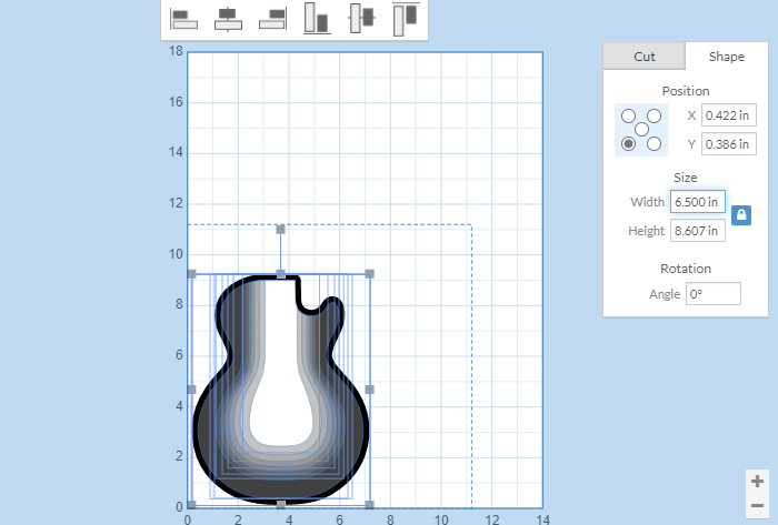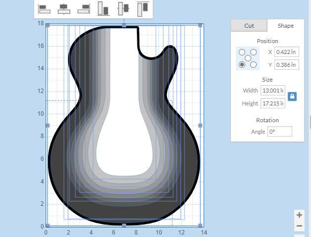 You will need to do the math to determine the part size. You should be able to scale it in the drawing program the dxf was created in too. Then open the drawing and highlight the parts you want to resize. I just surrounded all of them at once in the guitar body above. Then click the shape tab and click “lock”. Enter one number and the other will change.